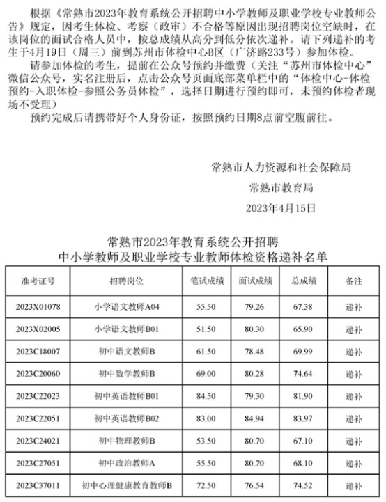 蘇州常熟市2023年教育系統(tǒng)公開招聘中小學(xué)教師及職業(yè)學(xué)校專業(yè)教師體檢資格遞補(bǔ)公告