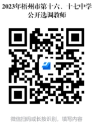 本次公開選調(diào)報(bào)名采用網(wǎng)絡(luò)形式進(jìn)行,一人只可報(bào)名一個(gè)學(xué)校的一個(gè)崗位,多報(bào)無效。符合選調(diào)條件,個(gè)人愿意到梧州市第十六、十七中學(xué)工作的,掃描公告下方報(bào)名二維碼并填寫相關(guān)內(nèi)容,同時(shí)填寫梧州市第十六、十七中學(xué)公開選調(diào)教師報(bào)名表(附件2),連同相關(guān)材料,于2023年5月9日17:00前發(fā)送到梧州市第十六、十七中學(xué)郵箱。