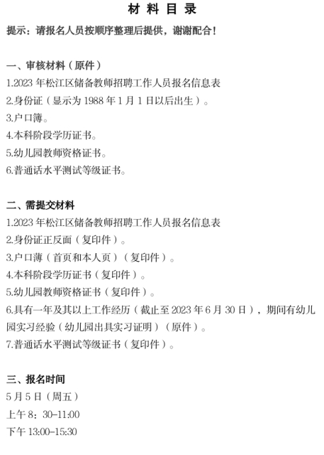 2.報(bào)名須知。報(bào)名時請下載并打印好《2023年松江區(qū)儲備教師招聘工作人員報(bào)名信息表》(附件1),本人一寸免冠近照2張(其中一張?jiān)趫?bào)名表上貼好),同時本人攜帶身份證、戶口簿、學(xué)歷證書、幼兒園教師資格證書、普通話水平測試等級證書等原件、復(fù)印件在預(yù)約時段來中心進(jìn)行現(xiàn)場報(bào)名。區(qū)教育局對報(bào)名人員進(jìn)行報(bào)名資格審查。(提示:綠色出行,教育黨群與人才服務(wù)中心周邊不提供車位)