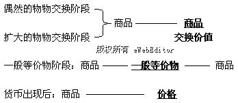 D、貨幣價(jià)值形式(價(jià)格):貨幣成為表現(xiàn)其它一切商品價(jià)值的固定的一般等價(jià)物。