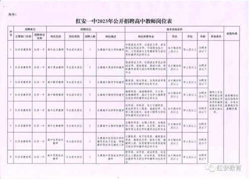 1.紅安一中2023年公開招聘高中教師崗位表。