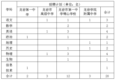 根據(jù)學(xué)校需求及引進(jìn)生具體情況,由龍巖市教育局統(tǒng)籌安排在龍巖一中、龍巖一中錦山學(xué)校、龍巖市高級(jí)中學(xué)、龍巖學(xué)院附屬中學(xué)工作。主要引進(jìn)語(yǔ)文、數(shù)學(xué)、英語(yǔ)、物理、生物、政治、歷史、地理、信息技術(shù)等學(xué)科教師。