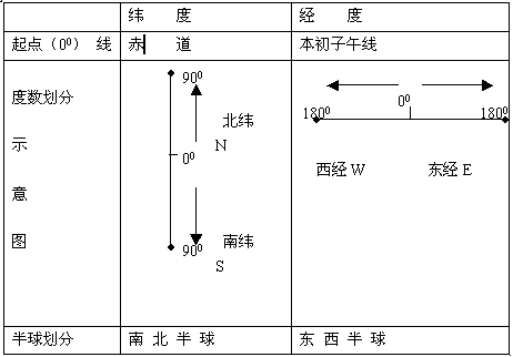[提出問題] 緯度的劃分比較簡(jiǎn)單。經(jīng)度的劃分比較難,請(qǐng)同學(xué)們討論完成經(jīng)度劃分、東西半球劃分的內(nèi)容。比一比,看哪組同學(xué)觀察更細(xì)、總結(jié)歸納的更準(zhǔn)確、更利于同學(xué)理解和掌握。討論結(jié)果可以按項(xiàng)目填入表中
