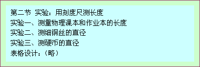 第二節(jié) 實驗:用刻度尺測長度 【課題】實驗:用刻度尺測長度 【重點難點分析】會用刻度尺測量長度,正確讀數(shù),用特殊方法測量長度. 【教學(xué)過程設(shè)計】  1,引入新課  2,按照實驗步驟進行實驗 測量課本和作業(yè)本的長和寬,把數(shù)據(jù)記錄在表格中,注意注明單位,在讀數(shù)時,應(yīng)當(dāng)在準(zhǔn)確值后面估計一位數(shù)值. 學(xué)生測量細(xì)銅絲的直徑時,應(yīng)當(dāng)注意把鐵絲緊密纏繞在鉛筆上,測量出總的長度,除以圈數(shù),得到細(xì)銅絲的直徑.記錄數(shù)據(jù)后,應(yīng)當(dāng)提出問題讓學(xué)生思考:如何測量一篇紙張的厚度,然后總結(jié)這是用累積法測量,今后這種方法還會用到,在實際的生產(chǎn)和生活中,這種方法經(jīng)常用到. 學(xué)生用刻度尺和三角板測量硬幣的直徑,應(yīng)當(dāng)讓學(xué)生思考,看看是否能夠想出方法.之后,用板圖幫助說明,并在記錄完成后,啟發(fā)學(xué)生進一步思考如何測量錐體的高度,如何測量不規(guī)則物體的長度等等,有條件的學(xué)?梢杂脛赢媮碚故荆部梢杂脠D片幫助學(xué)生想象,使學(xué)生能夠舉一反三.