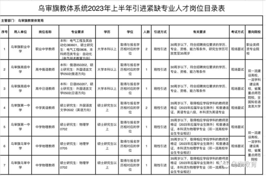 本次人才引進(jìn)共設(shè)7個(gè)崗位,計(jì)劃面向社會(huì)公開(kāi)引進(jìn)緊缺人才9名。具體信息和要求詳見(jiàn)《烏審旗教體系統(tǒng)2023年上半年引進(jìn)緊缺專業(yè)人才崗位目錄表》。