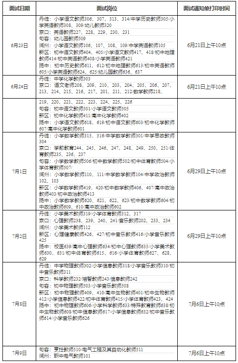 2023年揚(yáng)中市、句容市、京口區(qū)、潤(rùn)州區(qū)、丹徒區(qū)、鎮(zhèn)江新區(qū)六個(gè)轄市區(qū)教育系統(tǒng)公開(kāi)招聘教師和校醫(yī)集中面試將于2023年6月23日-7月9日分期分批舉行。為方便考生復(fù)習(xí)迎考,現(xiàn)就面試有關(guān)事項(xiàng)通告如下: