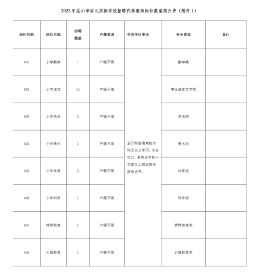 詳見《2023年昆山市裕元實驗學校招聘代課教師崗位數(shù)量簡介表》(附件1)。