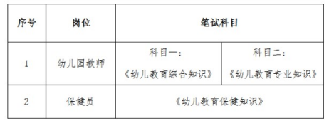 1.執(zhí)行園長(zhǎng)、副園長(zhǎng)崗位網(wǎng)上報(bào)名通過后直接進(jìn)入面試環(huán)節(jié),幼兒園教師、保健員崗位筆試采取閉卷形式進(jìn)行,考試科目如下表: