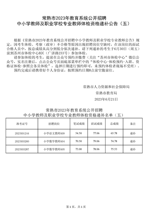 2023年蘇州常熟市教育系統(tǒng)公開招聘中小學(xué)教師及職業(yè)學(xué)校專業(yè)教師體檢資格遞補(bǔ)公告(五)