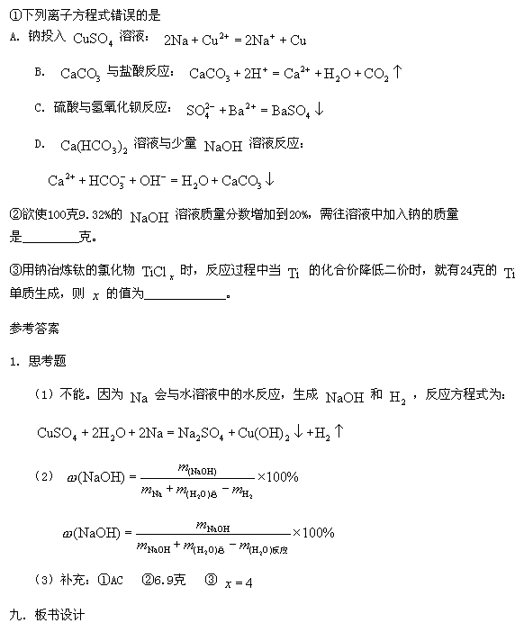 。4)學(xué)習(xí)了鈉與水的反應(yīng)后,緊接著可讓學(xué)生討論“鈉與硫酸銅溶液反應(yīng)會有什么現(xiàn)象發(fā)生?生成什么物質(zhì)?”再做鈉與硫酸銅溶液反應(yīng)的實驗來驗證。使學(xué)生對初中學(xué)習(xí)的金屬活動性順序有一個更深入、更全面、更科學(xué)的認(rèn)識,從而使學(xué)生認(rèn)識到任何規(guī)律都不是絕對的,而是有條件的這一辯證唯物主義的觀點。使學(xué)生樹立普遍性中存在特殊性的科學(xué)思想。教學(xué)設(shè)計示例