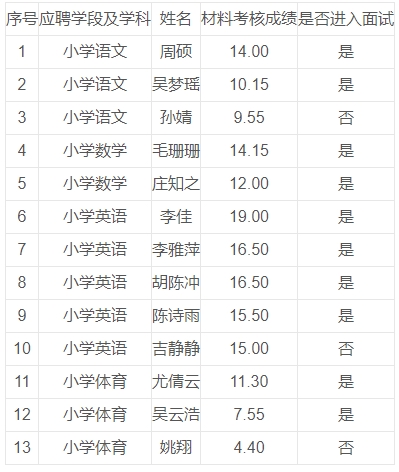 根據(jù)《宜興市城區(qū)學(xué)校2023年面向鄉(xiāng)村學(xué)校在編在崗教師公開(kāi)招聘公告》精神,經(jīng)資格審核、材料考核等程序,按崗位數(shù)1:2的比例確定參與面試人員,同分跟進(jìn),F(xiàn)將應(yīng)聘人員材料考核成績(jī)及進(jìn)入面試人員名單予以公布。