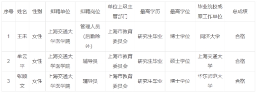 我單位根據(jù)《上海市事業(yè)單位公開招聘人員辦法》(滬人社規(guī)〔2019〕15號)的要求,擬錄以下3位同志,現(xiàn)將有關(guān)情況予以公示。公示期間,如有異議,請通過以下方式反映。