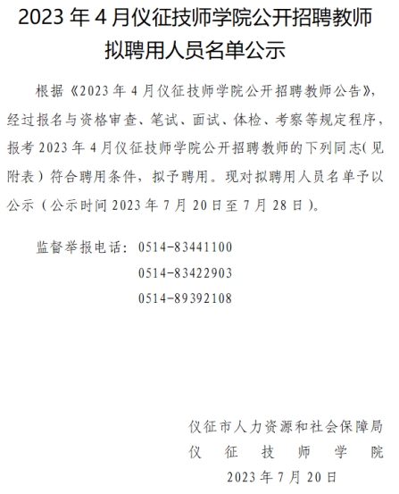 2023年4月?lián)P州儀征技師學(xué)院公開(kāi)招聘教師擬聘用人員名單公示