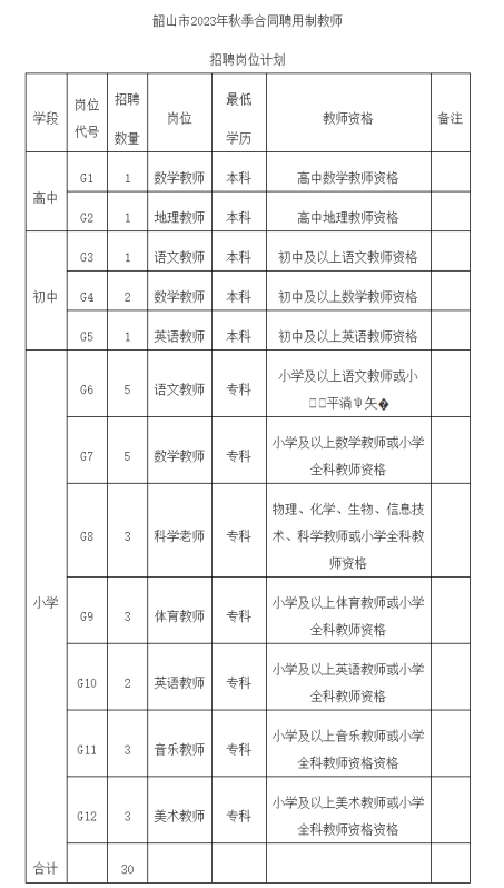 5.具備符合崗位要求的教師資格證,見附件《韶山市2023年秋季合同聘用制教師招聘崗位計劃》;