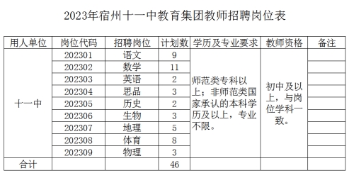 根據(jù)集團(tuán)校教育教學(xué)發(fā)展和教師隊伍建設(shè)的需要,經(jīng)研究,決定委托宿州市墉橋區(qū)勞動事務(wù)代理中心面向社會公開招聘教師46名。公告如下: