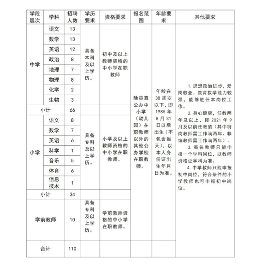 (2)初中教師崗位:①本科及以上學(xué)歷;②初級中學(xué)及以上教師資格證,教師資格證任教學(xué)科須與報考崗位學(xué)科一致。