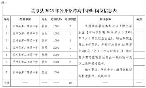 本次計劃招聘高中教師10名,具體崗位見《蘭考縣2023年公開招聘高中教師崗位信息表》(附件)。