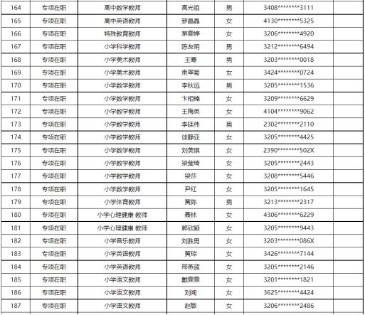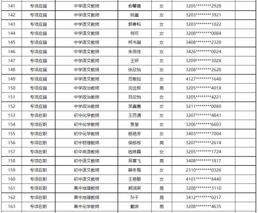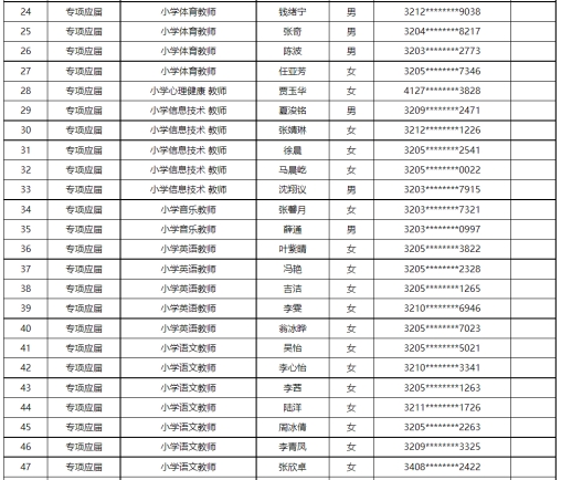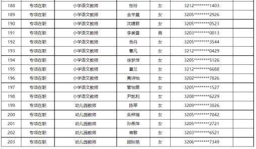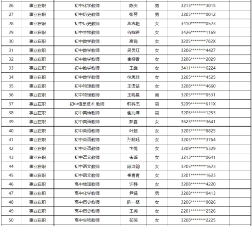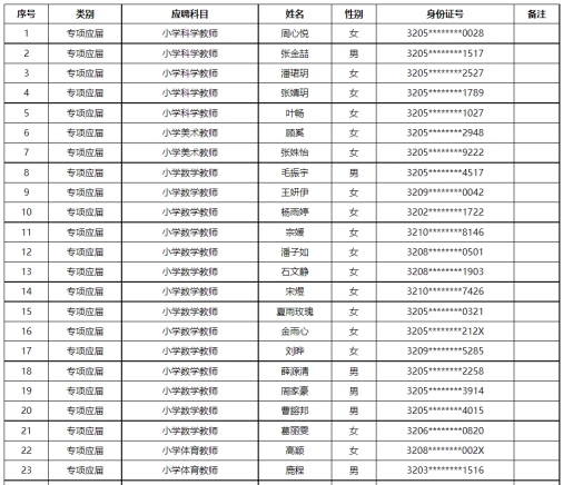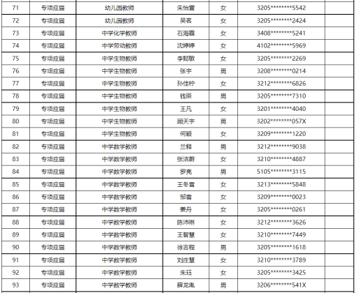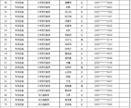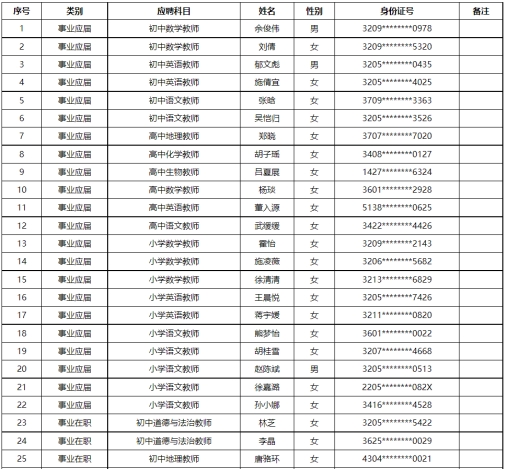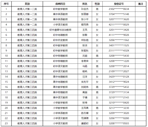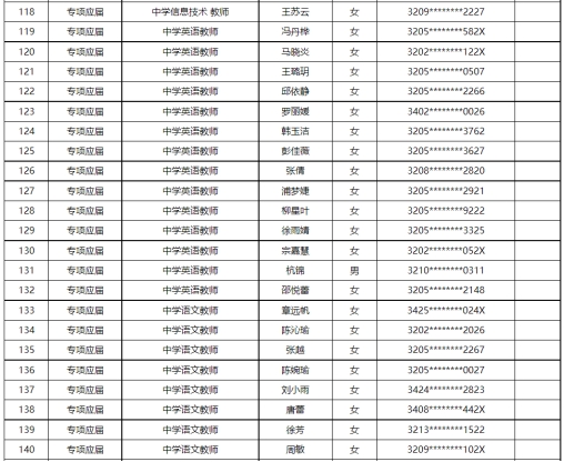 根據(jù)《2023年蘇州高新區(qū)教育系統(tǒng)公開招聘事業(yè)編制高層次、緊缺型教育人才公告》、《2023年蘇州高新區(qū)教育系統(tǒng)公開招聘事業(yè)編制教師公告》、《2023年蘇州高新區(qū)公開招聘教育專項(xiàng)編制教師公告》要求,經(jīng)過報名、考試、體檢和政審,擬錄用以下同志,現(xiàn)公示如下: