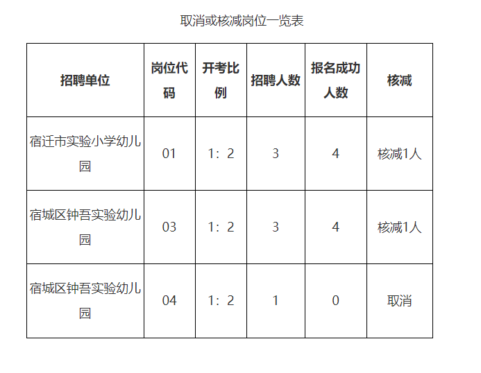 2023年宿城區(qū)城區(qū)部分公辦幼兒園區(qū)內(nèi)公開選聘教師報名工作已結(jié)束,根據(jù)《2023年宿城區(qū)城區(qū)部分公辦幼兒園區(qū)內(nèi)公開選聘教師公告》規(guī)定,現(xiàn)將未達(dá)到開考比例的崗位予取消或核減。