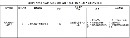 2、符合附件1《2023年天津市西青區(qū)張家窩鎮(zhèn)鎮(zhèn)屬公辦幼兒園編外工作人員招聘計(jì)劃表》崗位要求條件,具有天津市西青區(qū)戶籍;