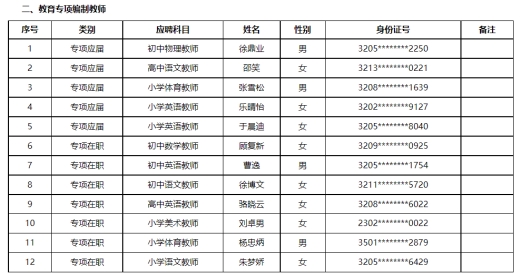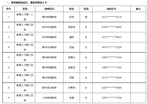 根據(jù)《2023年蘇州高新區(qū)教育系統(tǒng)第二批公開招聘事業(yè)編制高層次、緊缺型教育人才公告》、《2023年蘇州高新區(qū)第二批公開招聘教育專項(xiàng)編制教師公告》要求,經(jīng)過(guò)報(bào)名、考試、體檢和政審,擬錄用以下同志,現(xiàn)公示如下: