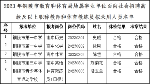 根據(jù)《2023年銅陵市教育和體育局局屬事業(yè)單位面向社會招聘高級及以上職稱教師和體育教練員公告》,經(jīng)體檢和考察,現(xiàn)將2023年銅陵市教育和體育局局屬事業(yè)單位面向社會招聘高級及以上職稱教師和體育教練員擬錄用人員予以公示。
