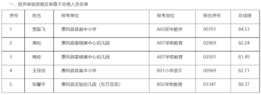 根據(jù)《2023年惠民縣教體系統(tǒng)公開招聘教師簡章》要求,對進(jìn)入考察范圍的100人進(jìn)行材料審查,其中放棄審查資格及審查不合格人員5人。詳細(xì)情況如下: