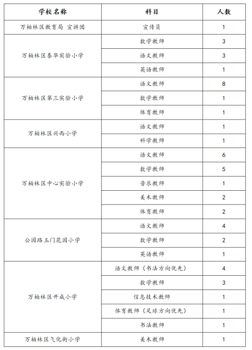 因萬柏林區(qū)教育局宣講團、泰華實驗小學、第三實驗小學、興西小學、中心實驗小學、公園路玉門花園小學、開成小學及氣化街小學均有教師離職,為滿足學校教學需要,介于學校特殊情況,不空缺崗位影響正常教學,現(xiàn)為各學校補充招聘政府購買服務教師,具體公告如下: