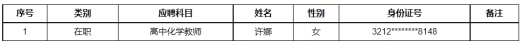 根據(jù)《2023年蘇州高新區(qū)教育系統(tǒng)公開招聘事業(yè)編制教師公告》、要求,經(jīng)過報(bào)名、考試、體檢和政審,擬錄用以下同志,現(xiàn)公示如下: