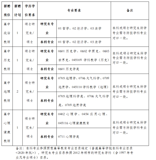 本次計(jì)劃招聘事業(yè)編制教師5人,崗位為高中政治1人、高中歷史1人、高中地理2人、心理健康1人。具體如下: