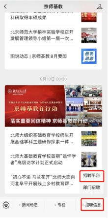 第五部:請應(yīng)聘者及時關(guān)注“京師基教”微信公眾號及報名網(wǎng)站通知信息,簡歷篩選通過后11月9日-15日(暫定)將于公眾號和報名網(wǎng)站發(fā)布考核確認(rèn)通知,逾時未操作視為自動放棄。