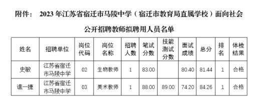 2023年江蘇省宿遷市馬陵中學(xué)(宿遷市教育局直屬學(xué)校)面向社會公開招聘教師體檢工作已經(jīng)結(jié)束,現(xiàn)將擬聘用人員名單予以公示。