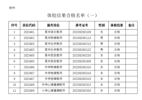 根據(jù)《新豐縣2023年下半年公開招聘公辦教師公告》和有關(guān)規(guī)定,我單位組織公開招聘進(jìn)入體檢環(huán)節(jié)的考生于9月28日和10月7日進(jìn)行了體檢,現(xiàn)將體檢結(jié)果合格人員名單進(jìn)行公示(詳見附件):