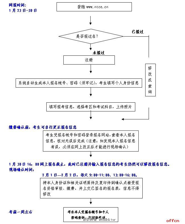 報名分為考生網(wǎng)上信息輸入和現(xiàn)場確認兩個階段。