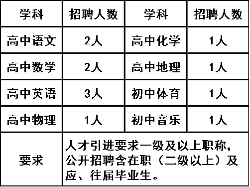 為適應(yīng)學(xué)校進一步發(fā)展的需要,適當(dāng)擴大高中招生規(guī)模,儲備部分學(xué)科教師,現(xiàn)面向全國引進6名優(yōu)秀教育教學(xué)人才,同時公開招聘5名優(yōu)秀高中學(xué)科教師。