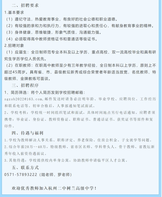 根據(jù)學(xué)校發(fā)展需要,杭州二中樹蘭高中誠邀優(yōu)秀教師加盟!