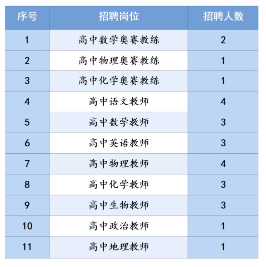 3、教師崗位要求:政治思想素質(zhì)高,具有扎實的專業(yè)理論基礎(chǔ)和過硬的業(yè)務技能,能夠勝任班主任工作或能有效組織學生活動。數(shù)學、物理、化學、生物學科能夠勝任奧賽教練的畢業(yè)生優(yōu)先考慮。