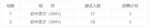 1.初中語文(3041)崗位共招聘6名,按招聘公告規(guī)定比例1:5確定(最后五名同分跟進(jìn))進(jìn)入面試考生共有35人,分兩組進(jìn)行面試,具體安排見下表。