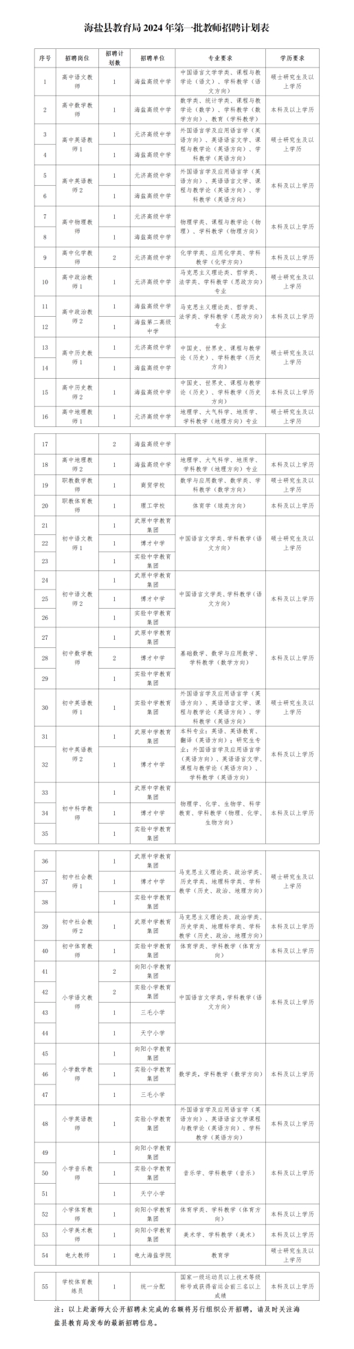 1.海鹽縣教育系統(tǒng)面向普通高校畢業(yè)生招聘2024學(xué)年教師分兩批進(jìn)行,第一批在2023年11月啟動,第二批在2024年4月啟動。第一批推出的崗位中未滿額的招聘計劃將并入第二批;