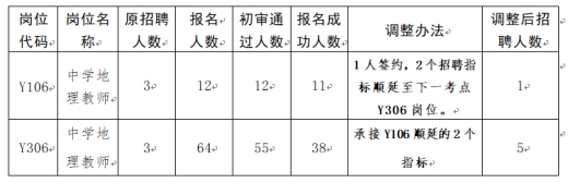 根據(jù)《無錫市惠山區(qū)教育局選聘2024年優(yōu)秀青年人才公告》(錫人社事招公告?zhèn)鋄2023]68號):“前一個考點招聘計劃未完成的,在同等招聘條件下指標可順延到下一個考點!。經(jīng)報請市級公開招聘綜合管理部門批準,現(xiàn)對部分招聘計劃進行調(diào)整。