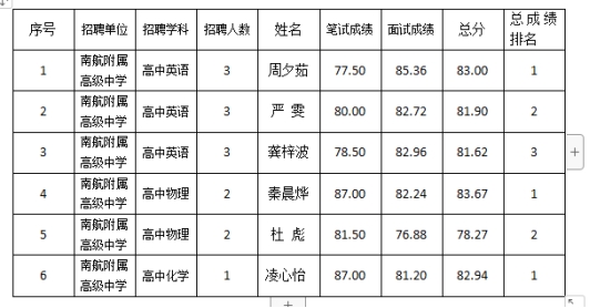 根據(jù)《南京市教育系統(tǒng)部分事業(yè)單位2023年公開招聘教師公告》(寧事招公告(R)(2023)30號)等文件精神,南京航空航天大學附屬高級中學2023年校園招聘新大學生面試工作已于2023年11月18日結(jié)束,F(xiàn)根據(jù)總成績排名,確定入圍體檢人員名單(入圍人員的體檢時間另行通知),并予以公示。如有異議,請于公示期間提出。
