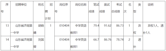 根據(jù)2023年濟(jì)南市教育局所屬學(xué)校(單位)引進(jìn)優(yōu)秀人才考察體檢情況,按照《2023年濟(jì)南市教育局所屬學(xué)校(單位)引進(jìn)優(yōu)秀人才公告》,對(duì)因考察體檢不合格或人員棄權(quán)造成的空缺,根據(jù)考試總成績(jī)由高分到低分依次等額遞補(bǔ),確定山東省濟(jì)南第一中學(xué)“中學(xué)英語(yǔ)教師1”崗位考察體檢棄權(quán)1人,遞補(bǔ)1人。