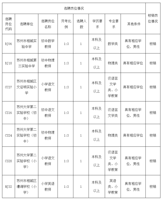2024年蘇州市相城區(qū)教育局選聘優(yōu)秀畢業(yè)生報名、資格初審工作已結(jié)束。根據(jù)公告規(guī)定,以下崗位未達(dá)到開考比例,予以核銷、核減,具體公告如下: