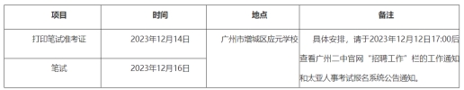 2、郵件主題為“免筆試+崗位+姓名”。經(jīng)審核確定符合要求的,方可免筆試。免筆試考生名單將于12月12日17:00后在廣州市第二中學(xué)官網(wǎng)“招聘工作”欄的工作通知和太亞人事考試報名系統(tǒng)公告通知中公布。