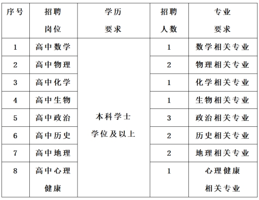 4.非應屆生:本科學士學位及以上,有相應學科高中教師資格證,中級專業(yè)技術資格的教師年齡要求40周歲(含)以內。副高級專業(yè)技術資格的教師年齡可放寬至50周歲。