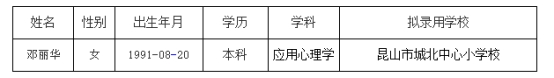 根據(jù)2023年昆山市教育系統(tǒng)公開招聘簡章,鄧麗華(人員信息附后)已通過昆山市教育局組織的筆試、面試、體檢(因懷孕緩檢)和考察,現(xiàn)進行錄用公示,公示時間為2024年1月5日~2024年1月15日。如對公示對象有異議,可在公示期間向昆山市教育局反映,聯(lián)系電話:57553129。