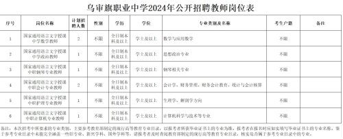 烏審旗職業(yè)中學始建于1987年,是全旗唯一一所以全日制辦學為主,集職業(yè)技術(shù)教育、技工教育、社會培訓、職業(yè)技能認定為一體的綜合性職業(yè)中學。因教育教學工作需要,現(xiàn)面向社會公開招聘數(shù)學教師2名、政治教師1名、鋼琴專業(yè)教師1名、會計專業(yè)教師2名、護理專業(yè)教師1名、計算機專業(yè)教師1名。有關(guān)事項公告如下: