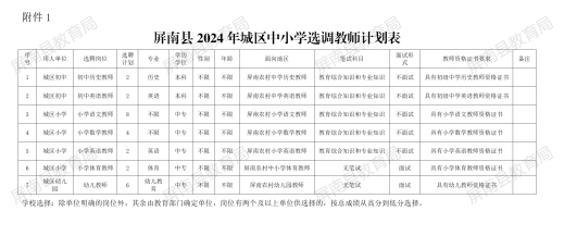 要求參加選調(diào)考核的鄉(xiāng)鎮(zhèn)教師須向所在學(xué)校遞交申請書。各鄉(xiāng)鎮(zhèn)學(xué)校須根據(jù)屏政辦〔2013〕25號文件規(guī)定的基本條件,并參照參加選調(diào)考核對象的德、能、勤、績表現(xiàn),召開校領(lǐng)導(dǎo)班子會議(或?qū)W校選調(diào)考核領(lǐng)導(dǎo)小組會議)集體討論決定,產(chǎn)生本校推薦對象(不受名額限制),并在校內(nèi)公示。推薦對象必須明確參加考核的學(xué)段(高中、初中、小學(xué)、幼兒園)學(xué)科,所報學(xué)科與所報人員的畢業(yè)專業(yè)一致(小學(xué)語文、數(shù)學(xué)不限)。各校公示的結(jié)果、附件2紙質(zhì)文檔及電子文檔于2024年3月14日前報送到教育局人事股(信箱:pn3328577@qq.com)。
