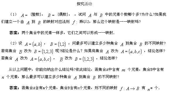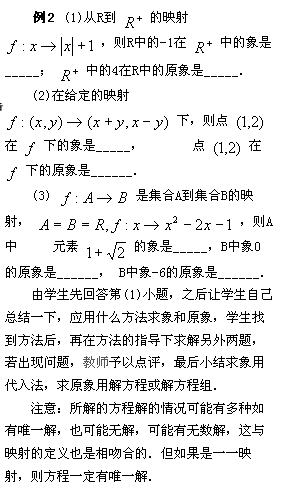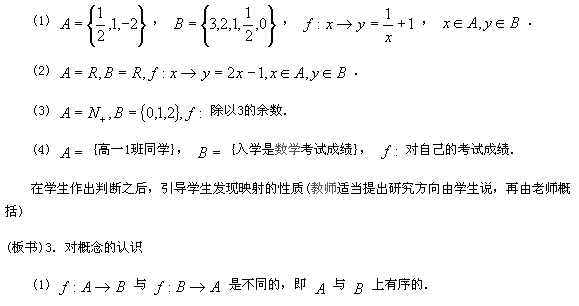 (開(kāi)始時(shí)只要是映射即可,之后可逐步提高要求,如集合是無(wú)限集,或生活中的例子等)由學(xué)生自己評(píng)判.之后教師再給出幾個(gè)(主要是補(bǔ)充學(xué)生舉例類(lèi)型的不足)