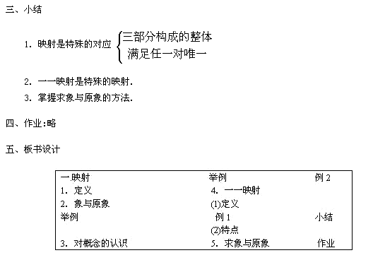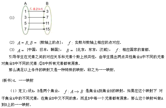 給出定義后,可再返回到剛才的例子,讓學(xué)生比較它與映射的區(qū)別,從而進(jìn)一步明確“一一”的含義.然后再安排一個(gè)例題.